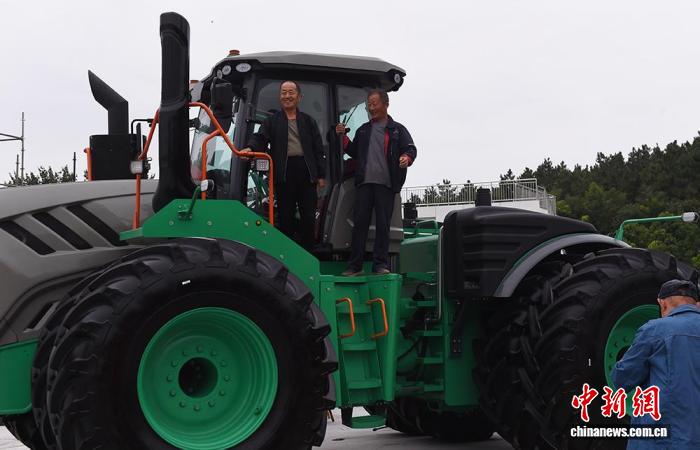 9月22日,在山东的Zhaoyuan,人们在中国农民收获节的全国霍加尔活动前夕参观了混合动力拖拉机。 Wang Jioni的照片